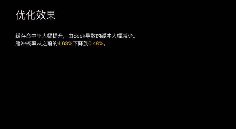 产生卡顿的用户里面,90% 是因为进行拖动,拖动之后又没有缓存数据,所以这里有可能导致缓存。统计效果也是比较明显的,上了分片缓存之后,之前的缓存概率是 4.6% 左右,最后下降到 0.48%,基本上看不到发生缓冲的场景。