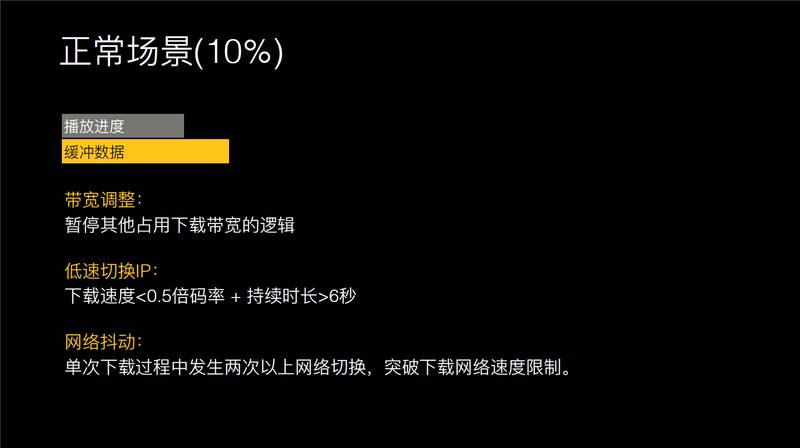 其实这有两个播放场景,一个是正常场景,边下边看,数据在下载。对于正常场景下载时会做一些带宽调整,在低速时会做切换 IP 的处理,比如说当前连通 IP 的耗时比较久的话,会做一些处理,也会对网络进行速度限制。