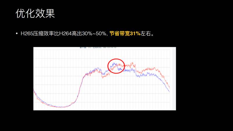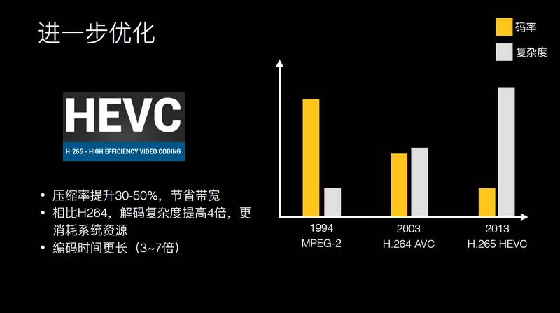 但这样肯定是不够的,因为流量涨的还是很明显的,我们想到 H.265,压缩率相对于 H.264 提升了 30%-50%,但它的复杂度也是呈指数级上升。复杂度导致它的编解码耗时更长,占用资源也更长。如果把 H.265 用在客户端上的话,可能要评估一些点,比如说在编码上面,现在手机上没有做 H.265 硬件支持的,相对于 H.264 的耗时 3-7 倍,之前耗时可能是 10 分钟,而现在可能需要到 70 分钟左右。