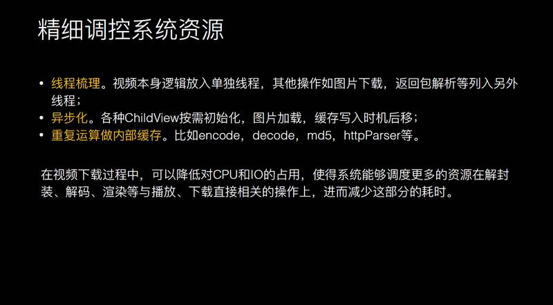 因为视频涉及到的流程比较多,在这个过程中还要更关注客户端的影响,要分析下客户端哪些在抢占视频播放资源,我们之前犯过一些错误,md5 会卡住一些流程,或者是 HttpParser 会阻止你的任务,会导致视频播放更慢。