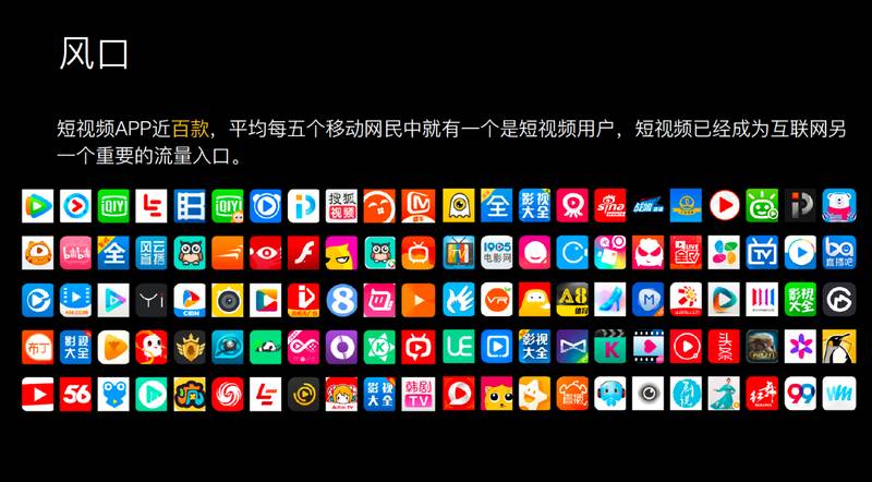 其实短视频已经不是一个新的概念,从 2006 年开始国内就有很多公司在做短视频。随着 Facebook 吹起短视频风,去年在短视频行业有近百款应用出现,中国网民里面每 5 个里面就有 1 个是短视频的用户,短视频成为互联网的流量入口。
