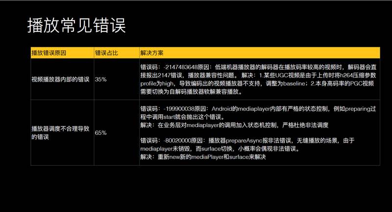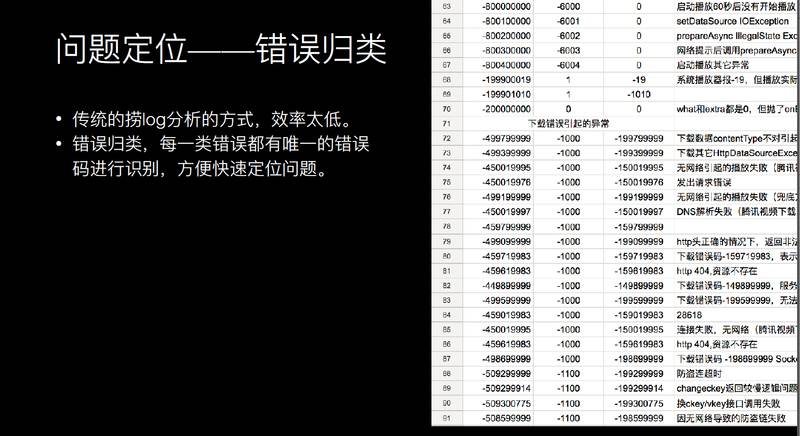 传统的捞 Log 方式大家都有,但是这种方式效率太低,需要等用户上线之后才能捞到 Log,Log 捞到之后还得花时间去分析。我们做法的是在关键问题上做一些插装,把每一类错误和每一个具体的子错误都能定义出来,这样一看错误码就知道播放错误是由什么原因导致的。