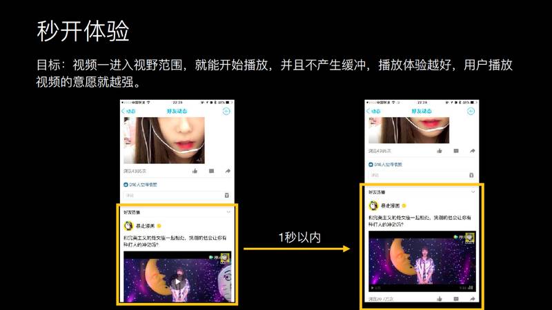 我们定了一个秒开技术指标,只要这个视频从到我的视野范围,到视频播出来之间的耗时在一秒以内。这也是对标 Facebook 的体验,Facebook 一打开动态,视频是能立即播出来的,不需要等待就能播,这个体验其实很顺畅。