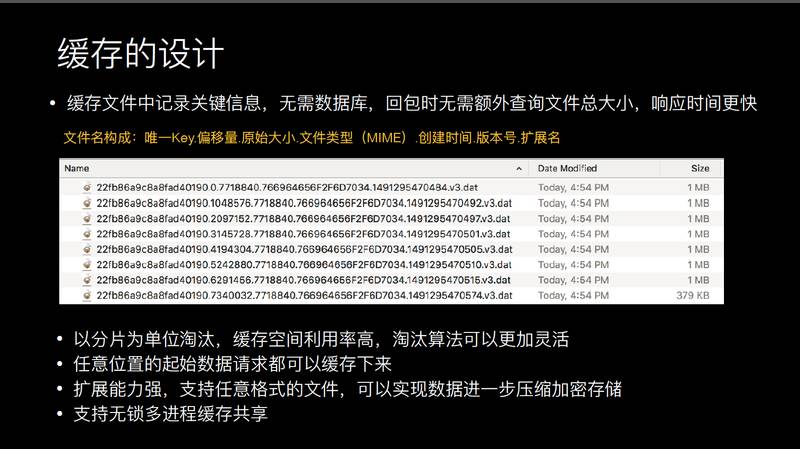 我们就对存储做了一次重构,支持文件空洞。会按照一兆的方式进行文件碎片划分,这就是视频的数据,每一兆就是个文件分片,通过它的 Key 和文件进行存储,这样好处是可以分段存储,可以允许逻辑空洞,拖动的话也可以在后面存储,也不依赖数据库,通过文件名可以知道是从哪个位置到哪个位置的存储。这样淘汰缓存高效一点,可以制定更灵活的缓存策略。可以淘汰更低粒度的文件,比如 seek 之后的文件可以保留,还可以对文件加密。