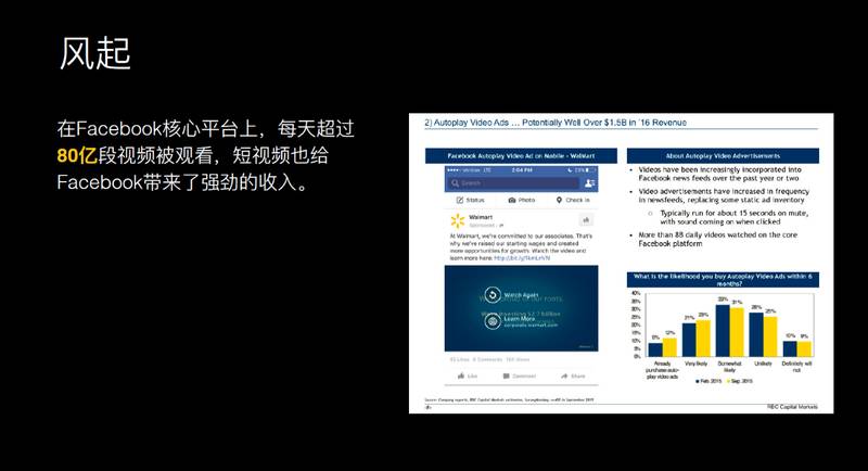 众所周知,短视频去年是一个风口,起因是来自 Facebook 2015 年 Q3 的财报,财报表明在 Facebook 平台上每天有 80 亿次短视频播放,给 Facebook 带来了强劲的广告收入,正是这个数据给国内核心大公司和创业公司带来的一些新的突破口。