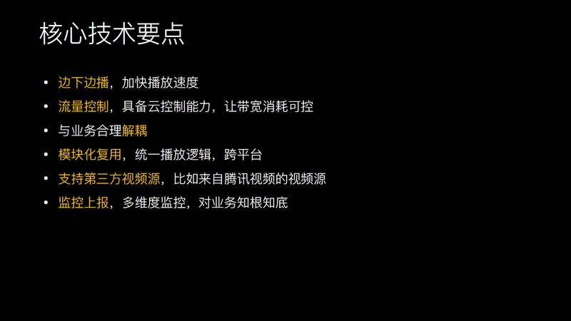 而这里的技术上的要点是非常关键的,第一个是边下边播,这是基础的要求,是为了加快视频播放速度。第二个是流量的控制,这么大的平台,之前只是做 5000 万的播放量,如果没有流量控制的云策略,可能到后面流量是无法把控的。第三,刚才讲到团队的现状,团队要负责两个 APP,这里要做代码复用,不可能再像之前一样四个团队维护四套代码,第四,我们支持第三方的视频源。第五,需要完善监控上报,对业务知根知底。