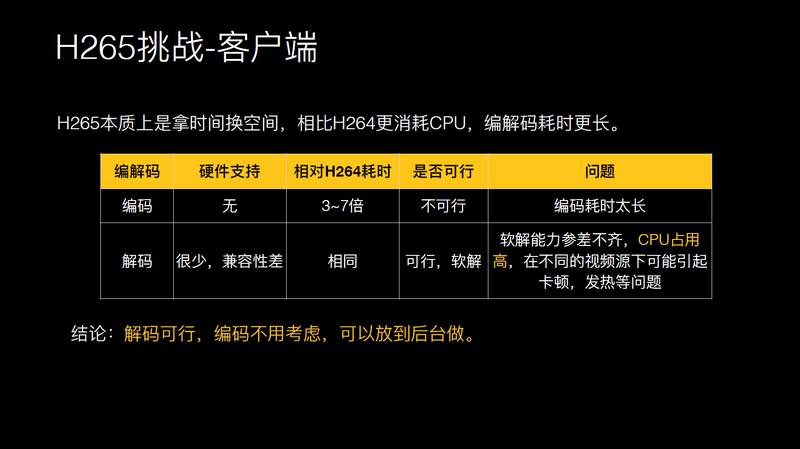 解码的硬件支持 H.265 的也很少,耗时差不多是一样的。解码是可行的,你可以采用软解的方式,这个带来的问题是 CPU 占用非常高,可能之前 H.264 占 20% 的 CPU,H.265 占 70%、80% 左右,带来的问题是发热和耗电。