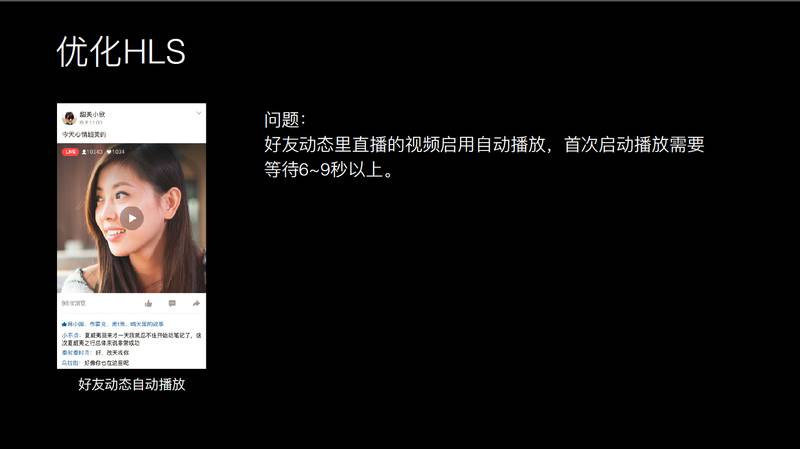在优化视频播放过程中,我们在 4 月份也做直播。直播这里面插入个事情,我们要播放直播的视频流,是 HLS 的视频,在好友动态里面可以观看直播的内容。HLS 在安卓上面体验非常差,因为安卓 3.0 之后对 HLS 基本没有做的优化工作,这里每次安卓上播放 HLS 需要等待 6-9 秒。