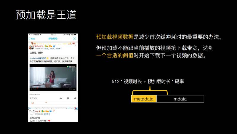 如果码率再进一步提升的话,可能会更大,这其实我们也做了一些场景分析,会发现我们是社交网站,它有好友动态,视频在好友动态里播放,或者是在视频浮层里播放,我们的选择是预加载的策略,这也是常见的策略。
