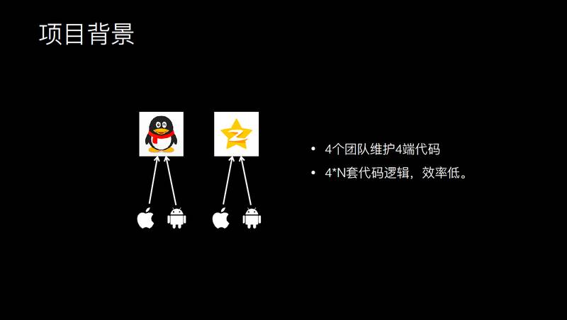 首先看快速上线,在开始之前,我先介绍一下我们的团队职责,我们团队负责手机 QQ 和手机 QQ 空间两个 APP,每个 APP 有 iOS 和 Android 两个团队,一共四个团队,四个团队负责两个 APP。在这个项目中,我们四个团队要针对两个平台实现四套逻辑,这里的效率是存在一定的问题。