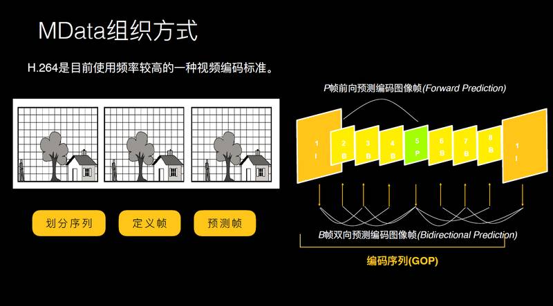 看一下 Mdata,视频的原数据。目前大部分是 H.264 编码,H.264 通过帧预测的方式进行视频编码。这里有一个 GOP 概念,也是在直播里面经常谈的。一般的播放器需要下载完整的 GOP 数据才可以播。