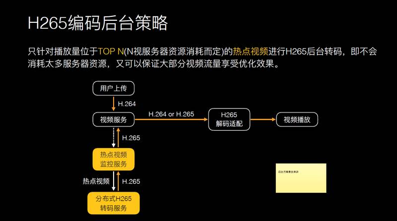 编码只能在后台做,如果在视频后台进行全面编码的话,是不现实的。因为编码复杂度呈指数级上升,拿后台服务器进行编码也是不可行的。我们的做法是只用热点视频进行后台转码,不是所有视频都去编码,对观看量在 TOP N 的视频进行编码,只需要编码少量的视频就可以带来流量优化效果,因为 TOP N 就占了全网 80-90% 的流量,只对少量的视频进行解码,让 90% 的视频享受转码的优势。
