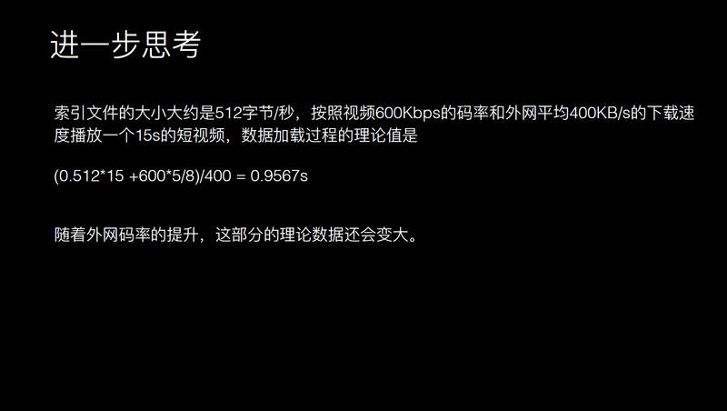 进一步思考,按照普遍 600K 码率的话,我们统计到现在 APP 上面下载的平均速度是 400K 左右,这样计算的话,可能在安卓上面播放一个视频的话,需要将近 0.9 秒左右才可以下载到你需要的数据。
