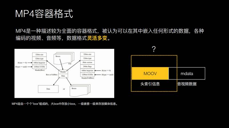 我们可以看一下 MP4 格式,MP4 其实是一个比较灵活的容器格式,每个东西都是用 Box 表达的,每个 Box 又可以嵌入到另外一个 Box。MP4 主要由 MOOV 和 Mdata 组成,MOOV 是囊括了所有的视频关键信息,肯定是先把 MOOV 下载完之后才能找视频数据才能播起来。不巧的是,在我们外网会发现有 5% 左右用户上传的视频,它的 MOOV 是在尾部的。后来也发现,有很多安卓手机比如说山寨机,一些摄像头处理的厂商可能比较偷懒,因为他们只有在你采集完信息之后才能知道他所有的信息,他可能把所有的信息放在尾部。