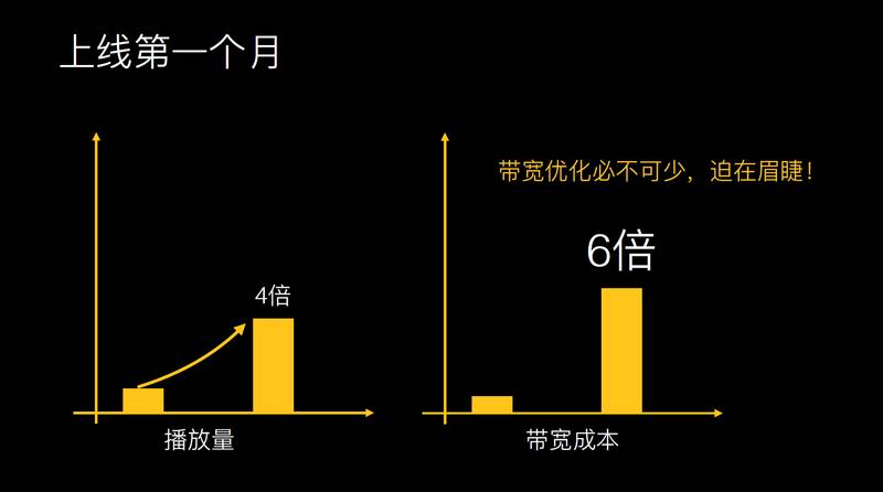 上线一个月之后,一个坏消息一个好消息。好消息是播放量涨了 4 倍,坏消息是带宽涨了 6 倍,带宽优化是每个做视频的人必须要面临的问题!