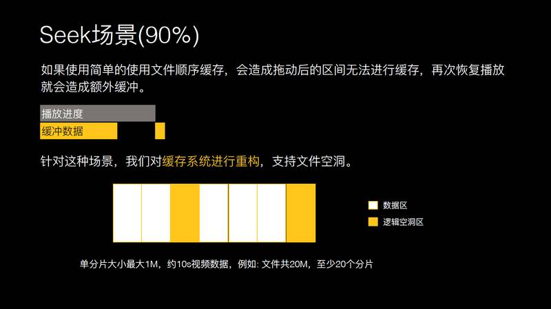 针对 Seek 场景,用户拖动,如果文件缓存系统是顺序存储系统的话,必然会造成拖到这里时,后面的缓存数据没有办法下载到系统里面来。只要用户每次拖动,拖动后的下载数据没法存到硬盘上来。
