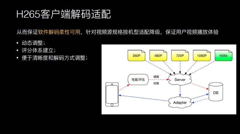 为了解决如何在我们手机上能够解码的问题,对手机的解码能力做一次评估。我在合适的时机做一次大规模的浮点数运算,将数据上传到后台服务器进行云适配。如果当前的指数满足 H.265 条件的话,可以给你下载 H.265 视频给你播放。从而保证软件解码柔性可用,针对视频源规格按机型适配降级,保证用户视频播放体验。