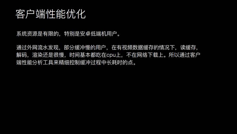 客户端的性能也是让人容易忽视的问题,发现有些用户虽然有视频的缓存,但是播起来还是很慢,这其实是客户端性能的影响。