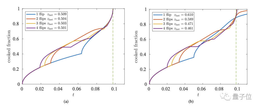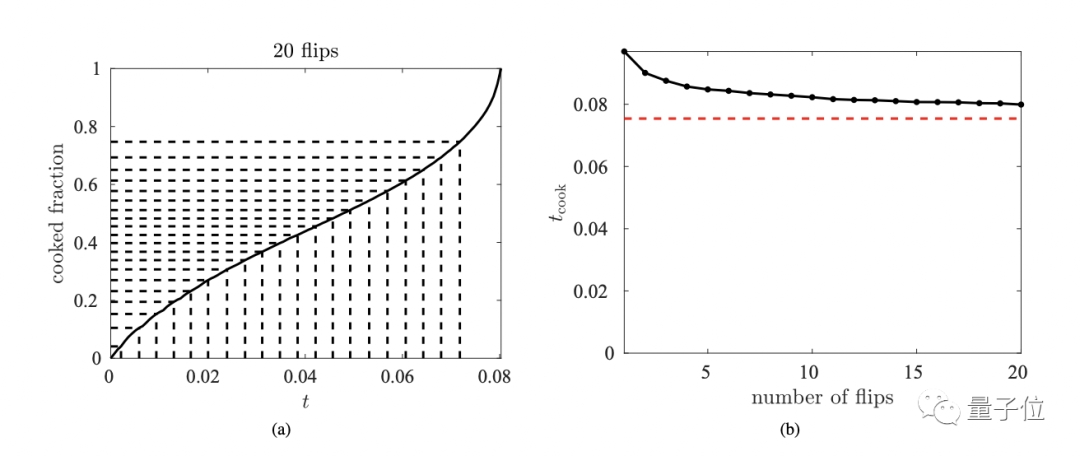 首先,在最优翻转次数——20次——情况下,最佳烹饪时间趋近于63秒,而单次翻转时间为80.5秒,相比之下可以将烤制时间减少29%。