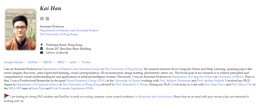 加入港大之前,他在 Google Research 担任 Visiting Faculty Researcher;在英国布里斯托大学计算机系担任助理教授;在牛津大学著名的 VGG 组进行博士后研究,师从 Andrew Zisserman 教授和 Andrea Vedaldi 教授。