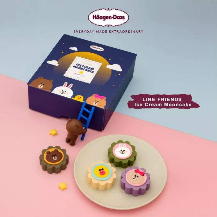哈根达斯Haagen-Dazs与Line Friends合作,推出了卡通人物形象Brown、Cony、Sally和Choco组合的冰淇淋月饼。
