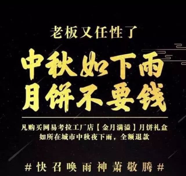 如果收货地址中秋夜下雨,便全额退款,类似于世界杯期间华帝做的“法国队夺冠就退款”。