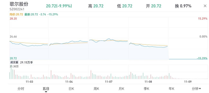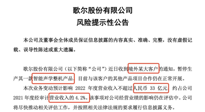 11月8日晚,歌尔股份发布风险提示性公告称:“ 近日收到境外某大客户的通知,暂停生产其一款智能声学整机产品。”