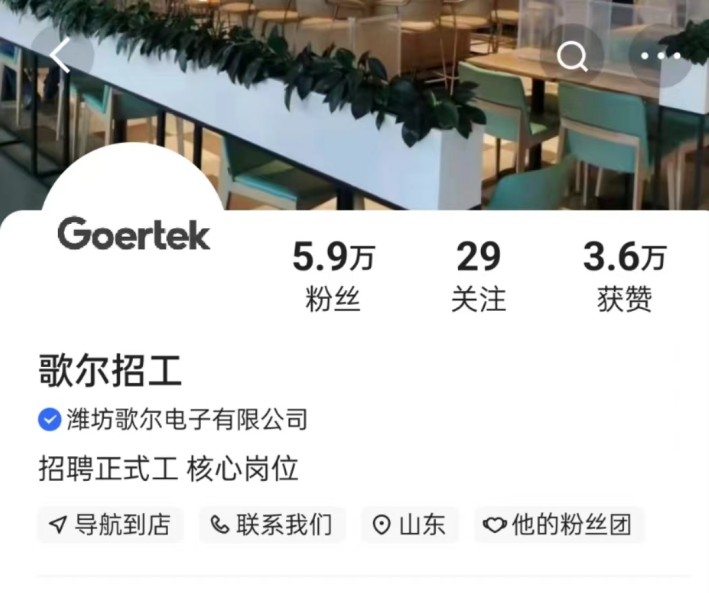 快手上,名为“歌尔招工”的潍坊歌尔电子有限公司蓝V官方认证账号,也从侧面印证了歌尔裁员和招聘暂停的真实性。该账号的招聘主播在9号晚的直播中表示:“走的都是小时工,歌尔正式工还可以在直播间报名,但现在不能入职,什么时候能入职还要等上面通知。”