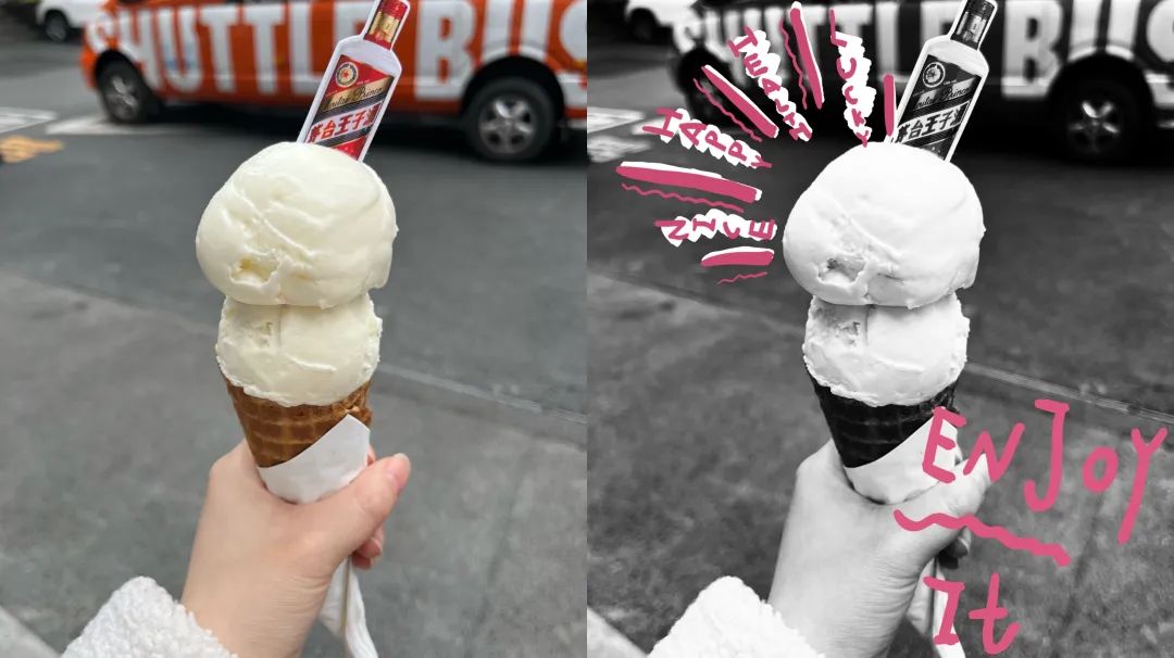 这个尤其适合拯救一些颜色杂乱的“废片”,黑白的滤镜抹去一切色彩,又加上手绘的黑粉sticker,俏皮又高级的感觉就来了。