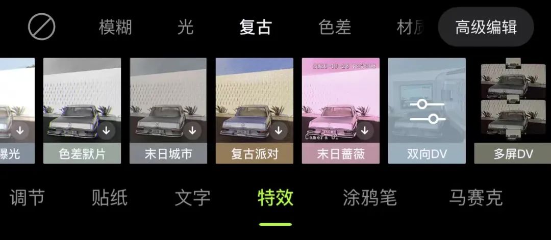 可能是现在相机、手机照相技术已经过于高清,人们又开始追求老相机的低画质质感。这个梦回千禧年的DV特效,就很适合一些表情管理失控的“废片”,特效的相机可以上下移动来遮住一些小瑕疵。