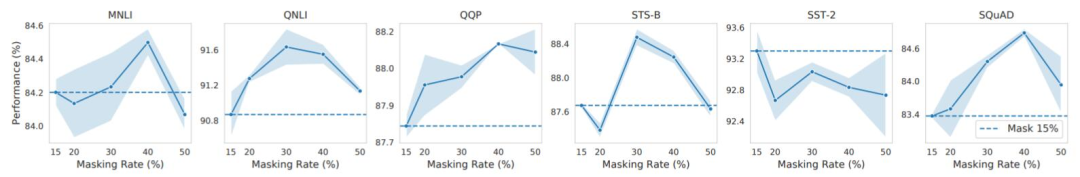 掩蔽语言模型通常使用15%的掩蔽率,研究者一般认为更高的掩蔽率会导致用来学习良好表征的上下文不足,而更低的掩蔽率则会导致训练成本太高。