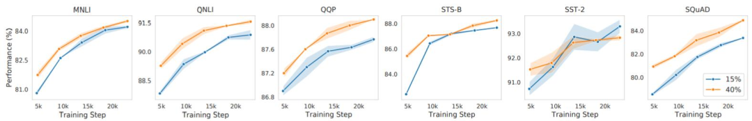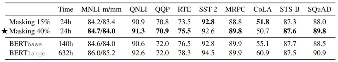 表2:大模型、高效预训练方法的条件下,15% 或40% 掩蔽率在 GLUE 基准上的测试结果对比。
