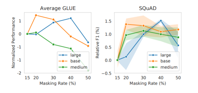 在普林斯顿大学陈丹琦等人的研究中,作者发现了与此前结论完全不同的情况:在有效的预训练方案下,他们可以掩蔽 40-50% 的输入文本,并获得比默认的 15% 更好的下游性能。