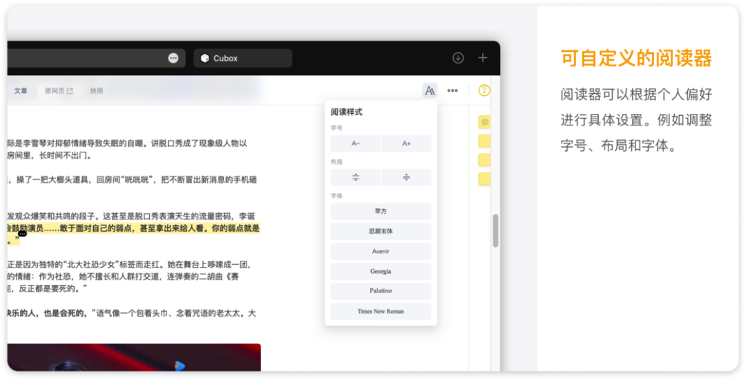 相比于用笔记工具来管理「系统化信息」的阅读,Cubox 可以让碎片信息管理变得简单:减少信息录入成本,Cubox 的解析功能甚至可以通过微信发送的链接,或者任何地方复制的链接,来直接采集内容本身;保留信息的原始属性,比如作者、原网址、文章封面图等;Cubox 还提供标注功能,可以高亮文字片段或图片,并写下相应的笔记。