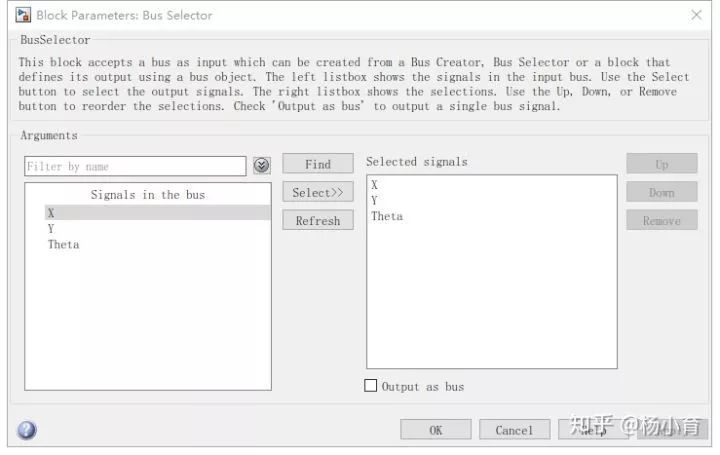 从Simulink library browser中添加bus assignment模块,并双击打开如下窗口,使用select按钮进行输出通道设置