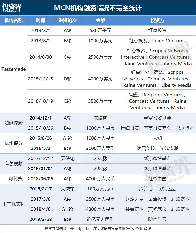 对于近年来MCN机构融资情况,投资界进行了不完全统计,除去2013年在海外成立、专做全球美食视频Tastemade已经拿到E轮融资外,目前为止,其他知名的MCN机构融资均停留在B轮及以前。