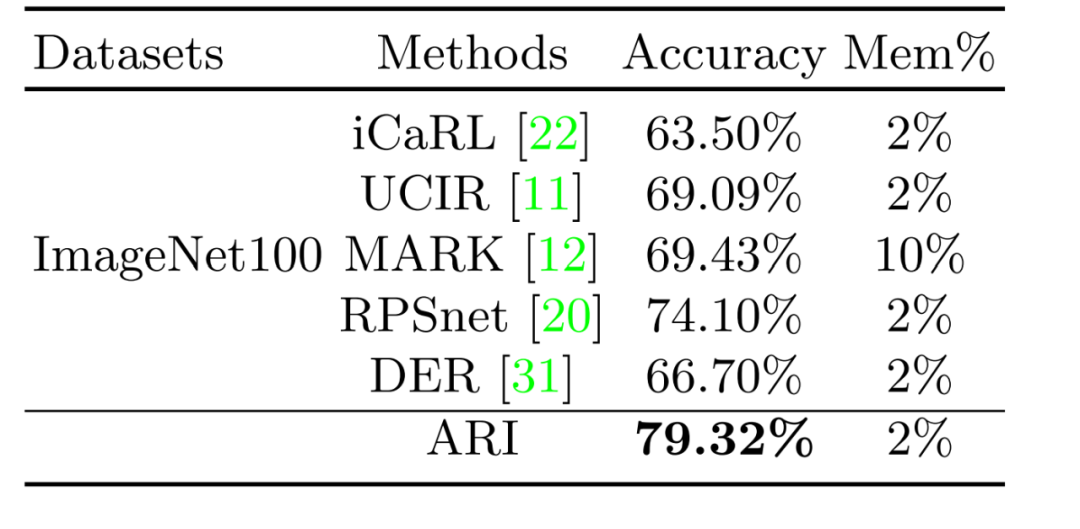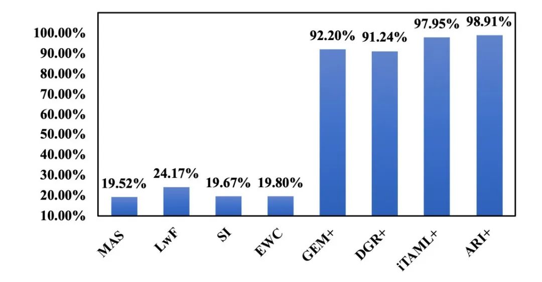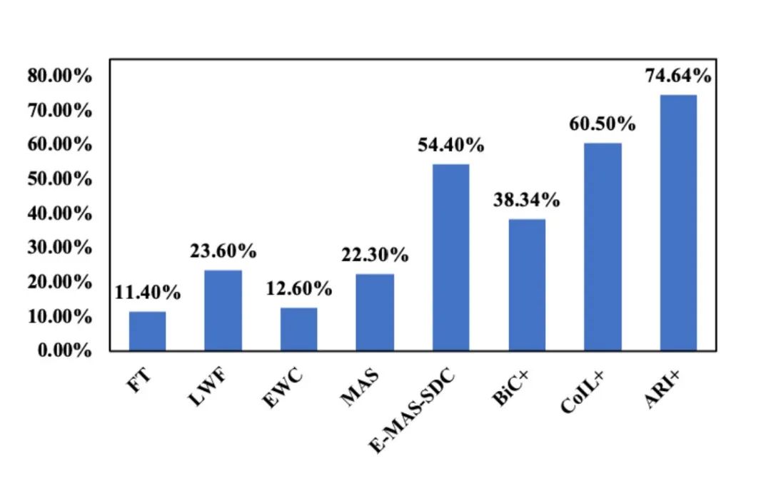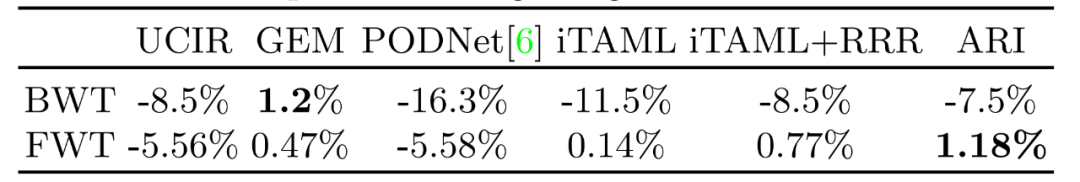 在平均准确率有着明显提升的情况下,ARI有着较低的BWT以及更高的FWT。