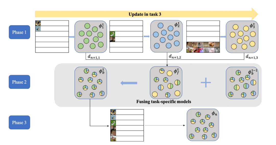 在第二阶段,我们将现有模型与刚刚的学到的模型结合起来。它不同于直接更新预训练模型的传统的增量学习方式,因为那样很容易造成遗忘。因此,我们将要学习的知识组织成不同的任务。每个任务都是单独学习的,并且各输出单独的模型。最后我们提出了一种针对任务的模型融合方法,能够保障不同任务所对应的模型能够收敛到一个公共的最优模型以减少信息损失。