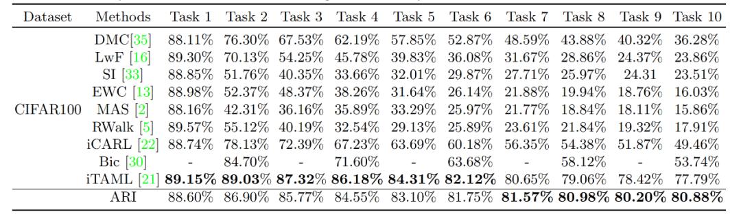 表 1 CIFAR100数据集上平均准确率的比较。任务t的准确率表示从任务1到t的平均准确率
