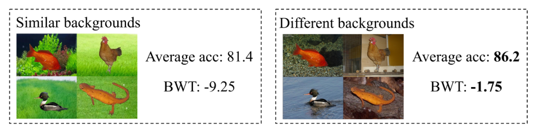 我们还进行了一系列消融实验验证我们的方法。为了证明相似的背景会导致遗忘,我们构建了一个仅有10个类别的数据集,每个类别含有100张训练和50张测试图片,在实验组中,我们更改训练图片成相近的的背景,测试图片不做修改,对照组采用未做修改的原始图片。我们构建了5个任务,每个任务2个类的增量学习任务。我们衡量了模型学习完全部任务后的平均准确率和BWT,发现相似的背景特征会导致遗忘。