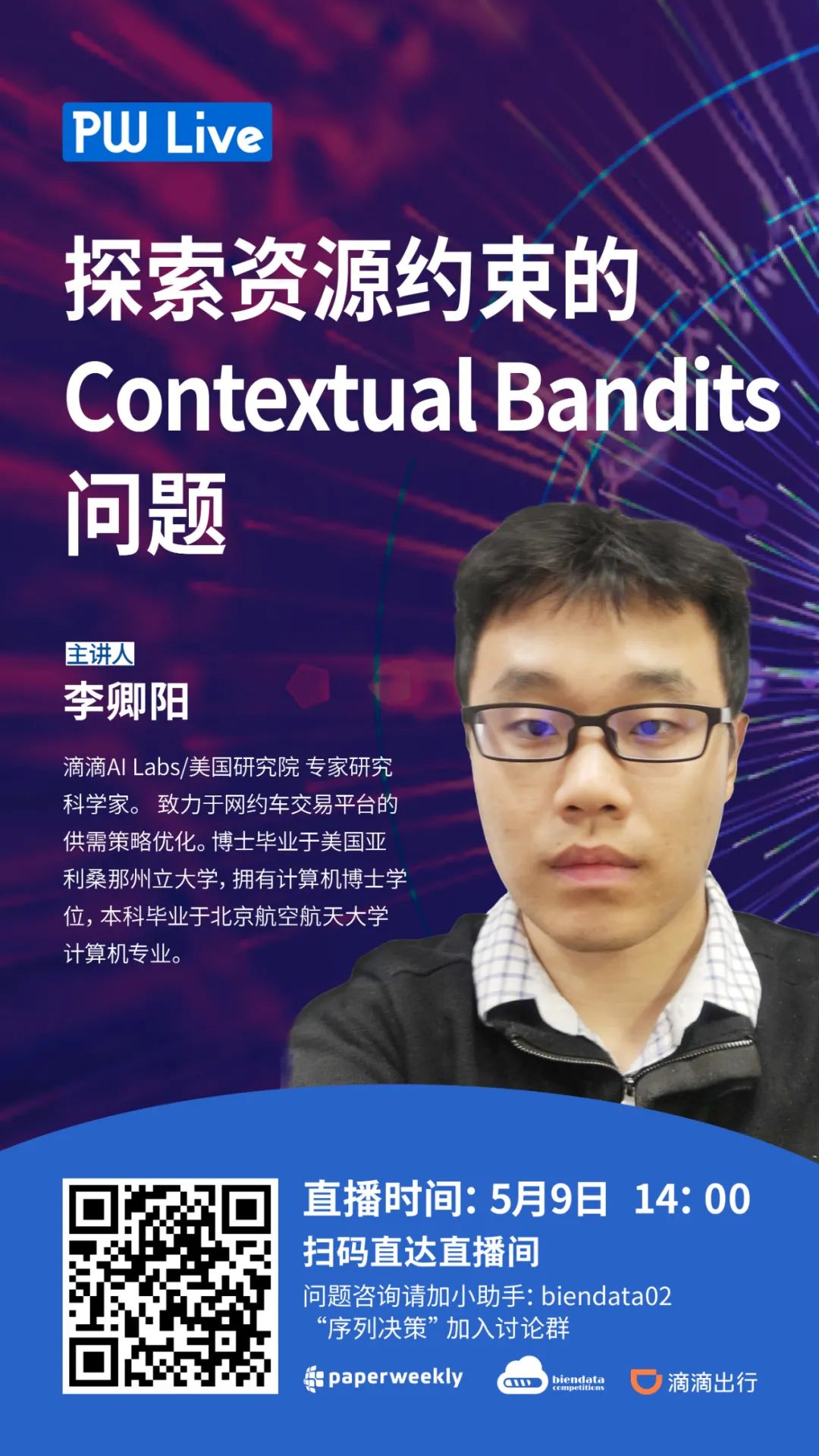 本期 PW Live,我们邀请到滴滴 AI Labs / 美国研究院专家研究科学家李卿阳,为大家带来探索资源约束的 Contextual Bandits 问题的主题分享。