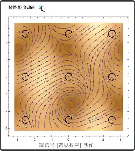 在平面区域旋度(环量密度, Circulation Density)正向为绕 z 轴逆时针旋转, 可视为流体绕某一点旋转的速率. 在旋转方向为逆时针则旋度的 k-分量为正, 反之为负. 也就相当在度量一个"涡轮"以什么方向旋转以及旋转有多快, 可以观察下面动画: