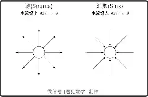 观察下图动画, 如果 Source 处散度为正, 则流体从源处流出, 如果为负, 则流进(或压缩)到该点处.