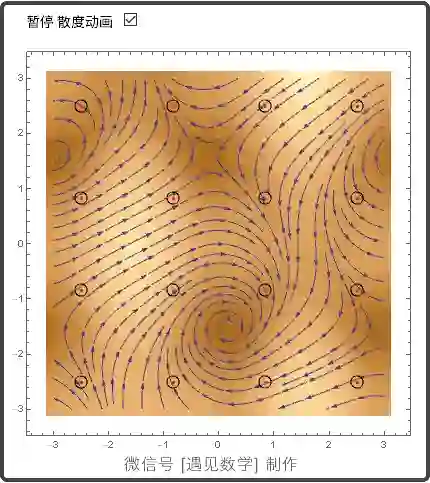 观察下面两个动图, 在向量场 F(x,y)=(Cos(y)-1. Sin(x)^3, -0.1 y-1. Sin(x)) 中取 9 个不同点处的旋度和散度的情况: