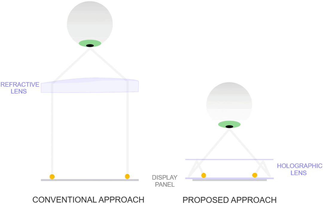 同时 Facebook 一直在开发一种新的“光学架构”,使这些 VR 眼镜的紧凑外观成为可能。它结合了全息技术和特殊的光学折叠技术,简单地说,就是将光弯曲并反射回自身,从而节省了很多镜头空间。也就意味着 VR 眼镜未来会像普通太阳镜一样轻便。这种技术一旦实现,将极大的提高VR设备的可携带性,进一步扩大它的使用场景。