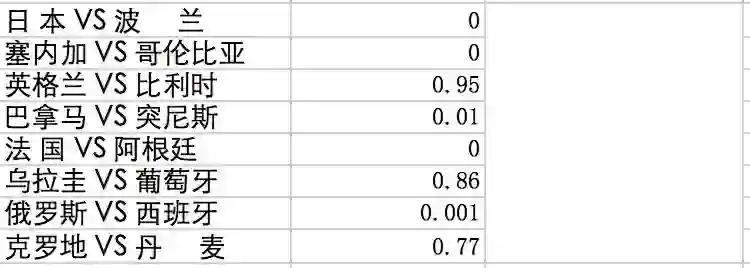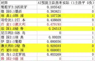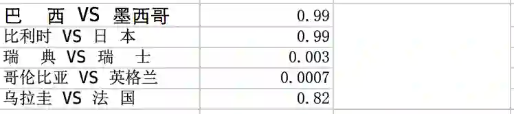 这就是足球的迷人地方,error 包含了韩国对德国这个超大冷门,我们的程序预测韩国胜率几乎为 0。