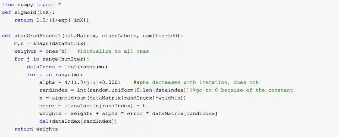 28 日晚 22 点前总共 44 场比赛,我们使用 Logistic 回归 +Sigmoid 函数分类方式处理(详情请阅读参考文献《机器学习实战》),训练算法为改进的随机梯度上升算法: