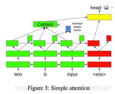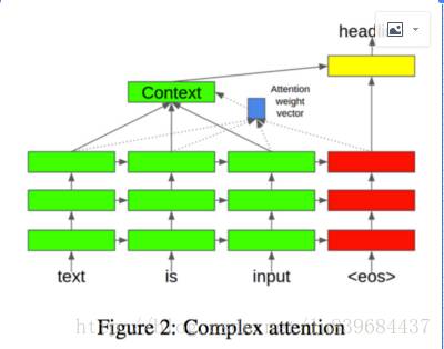 本文采用两种不同的注意力机制,第一种称作复杂注意力模型(complex attention),与Minh-Thang采用的点乘机制(dot mechanism)一样,看下图(包含隐藏向量和上下文向量):