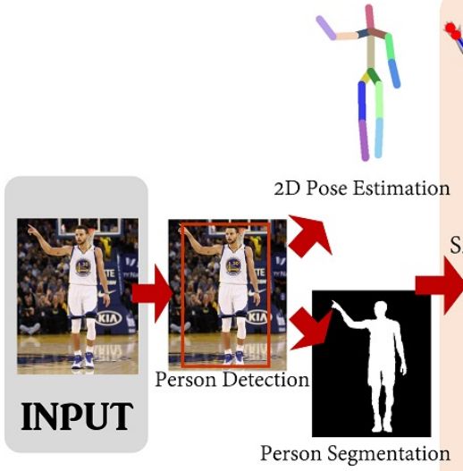 检测出来做两件事,一是用Mask R-CNN把人物扣取出来,二是用卷积姿势预测器(Convolutional Pose Machines)把姿势(2D pose)预测出来。