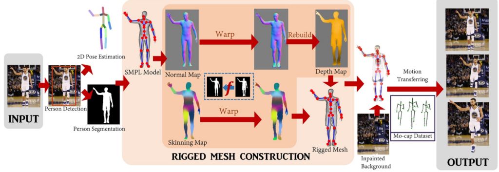 关键的难点在于中间部分,如何拿到人物的2D pose后,重建一个真实可用的3D骨骼蒙皮(Rigged mesh)?看看文章提出的方法: